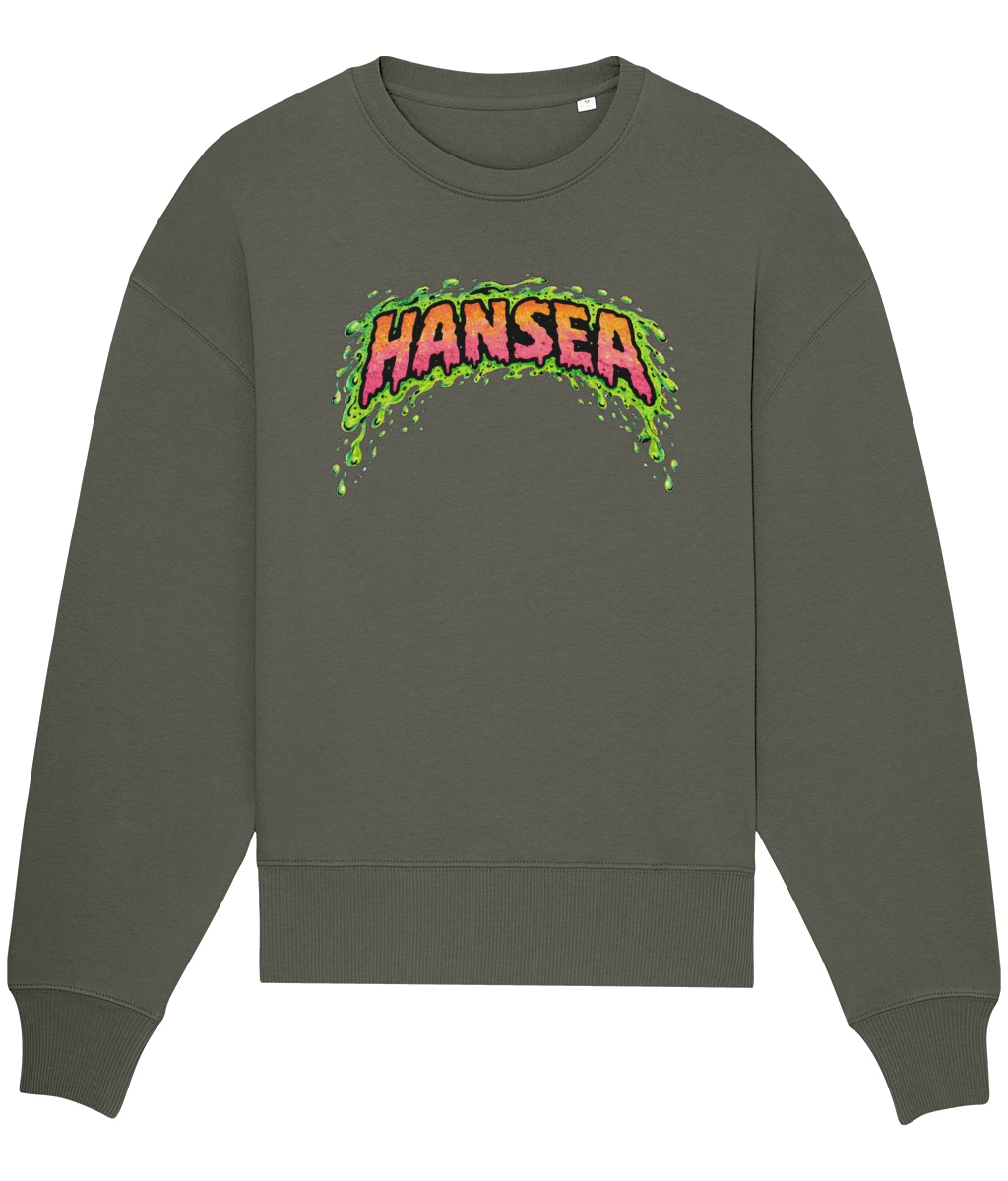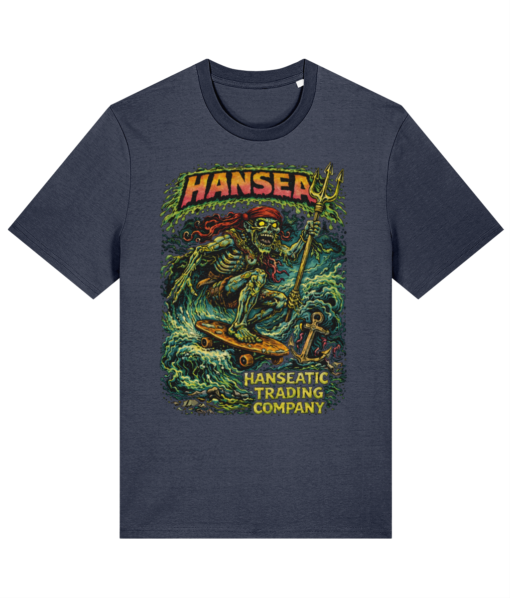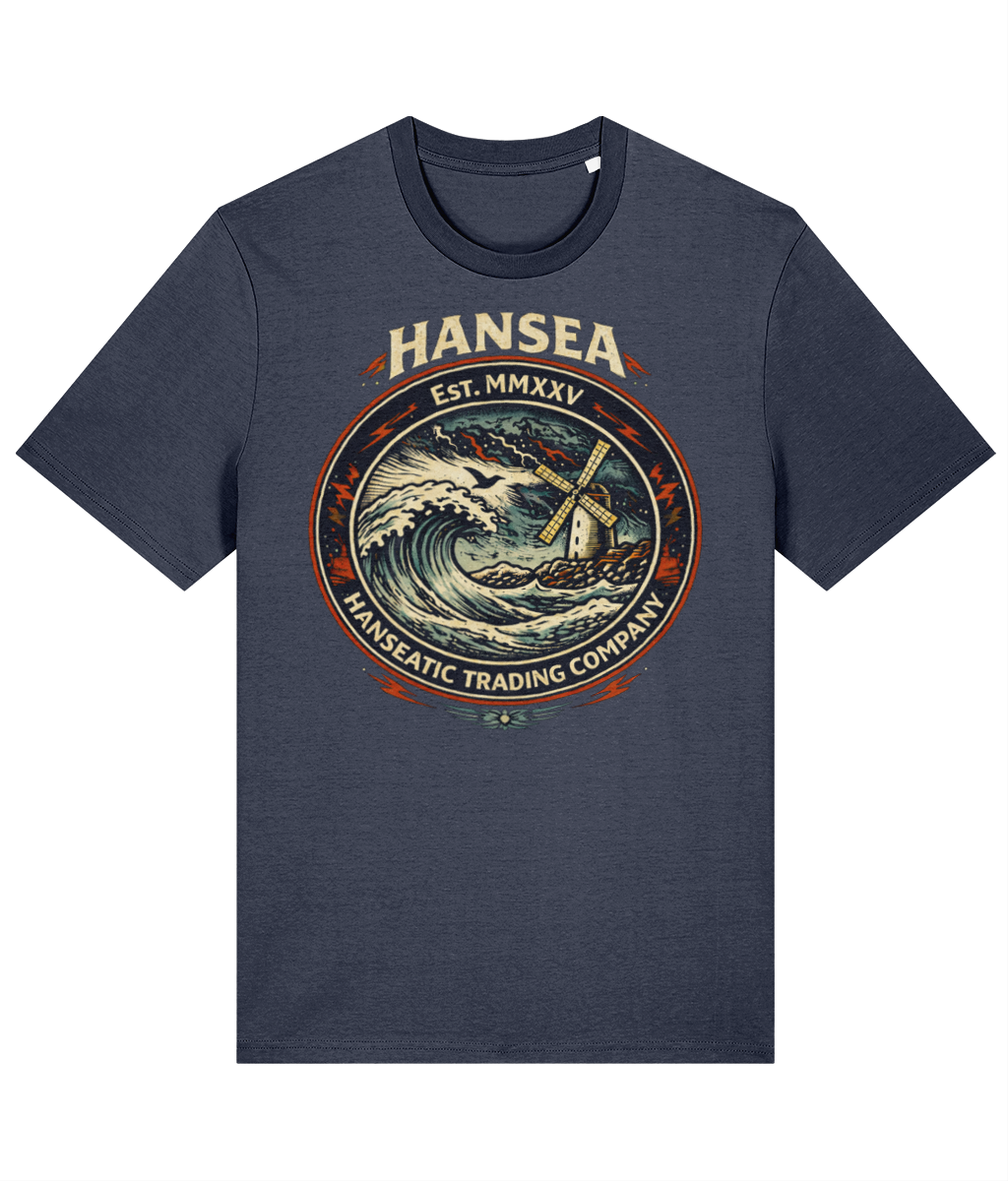 A vintage-style emblem with an eagle clutching a paddle, surrounded by stormy waters and lightning, with the text 'Hansea' at the top and 'North Sea Workwear' and 'Est. MMXXV' at the bottom.